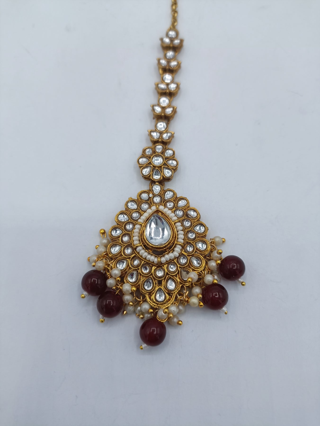 Traditional Kundan bridal set with Malla, jhumka and bindiya. Stunning set is available in green, pink and mint colour. It enhance your looks and make you gorgeous.