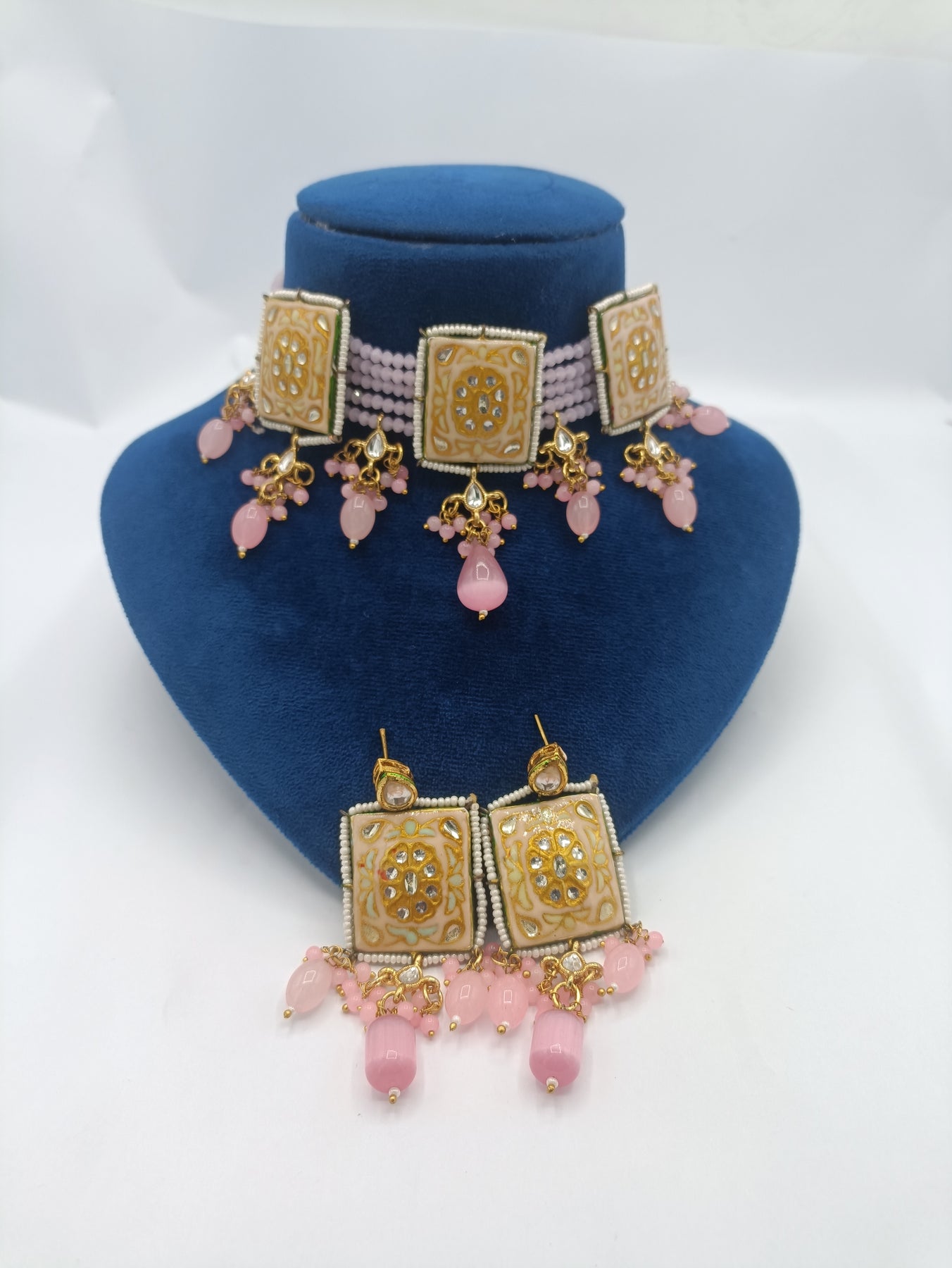 Turkish Kundan choker in powder pink, it's back is with meenakari. Heavy piroi is done with Kundan and monalisa beads.