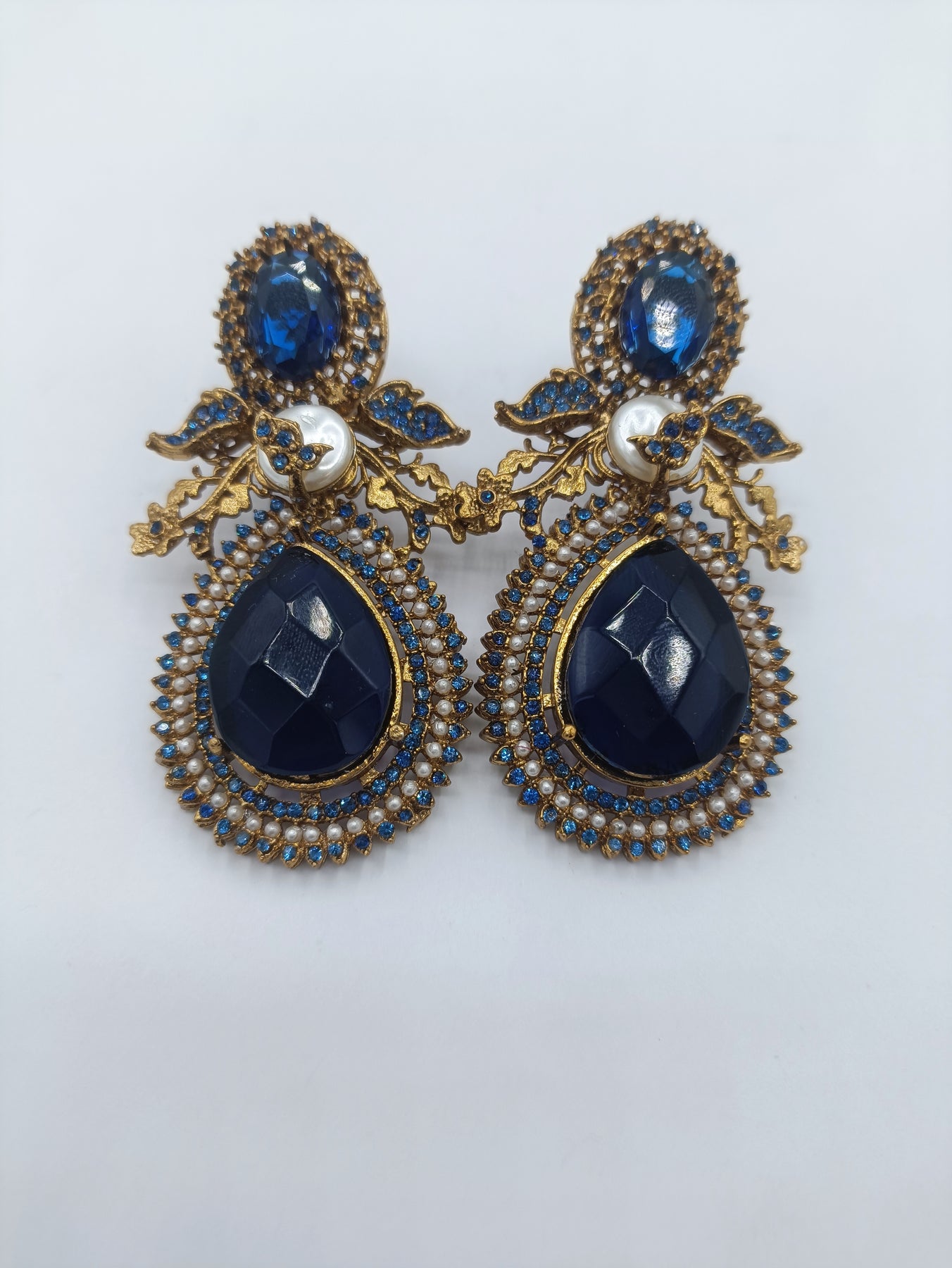 Elevate your look with Turkish inspired long Mala. Stunning 3D artwork with premium stones and fresh water pearls along with long earrings.