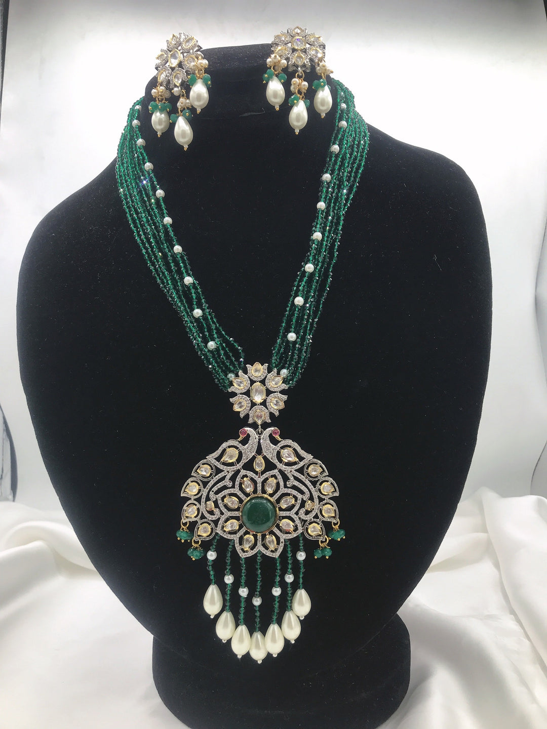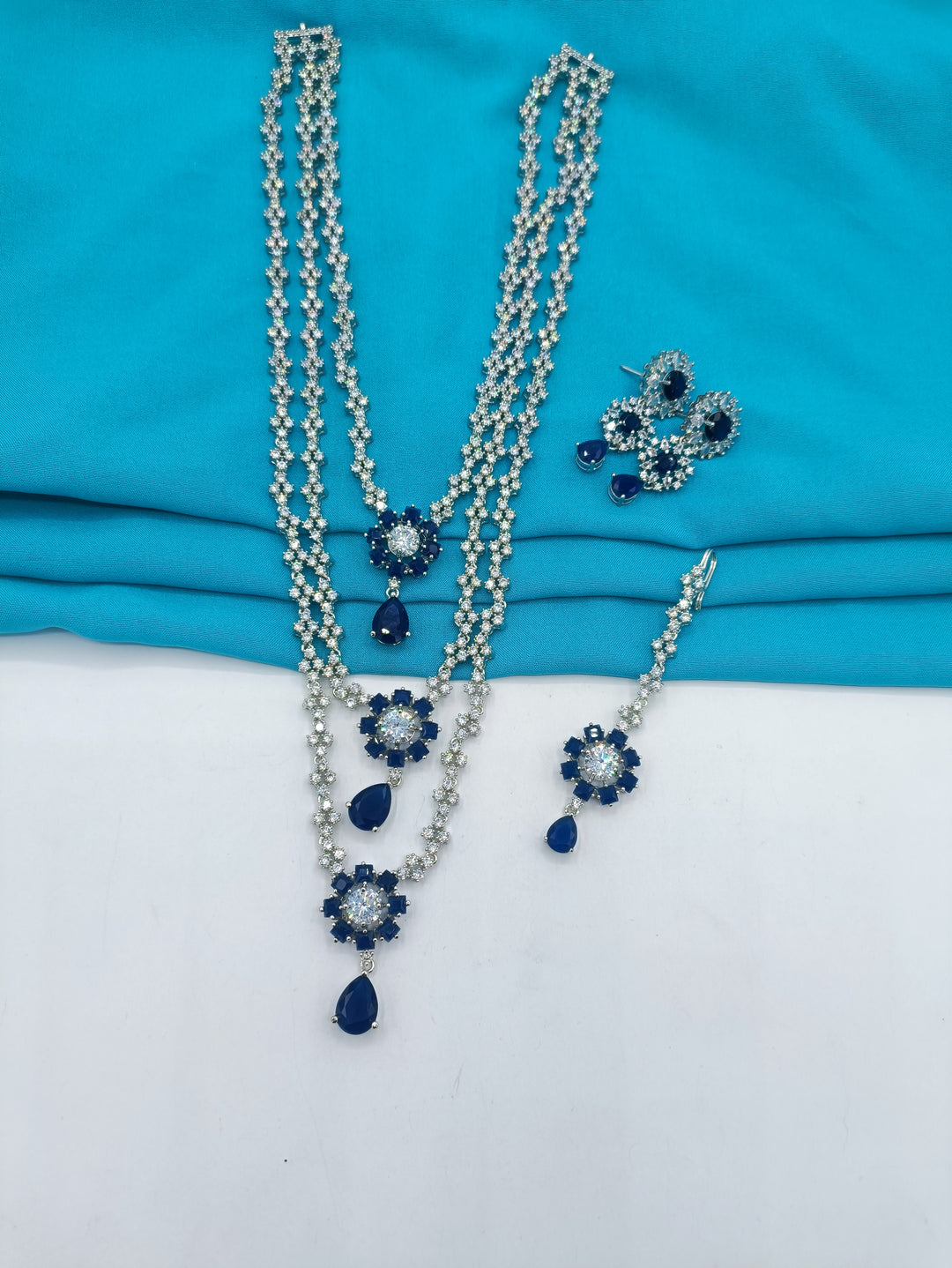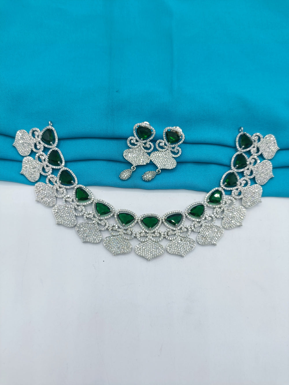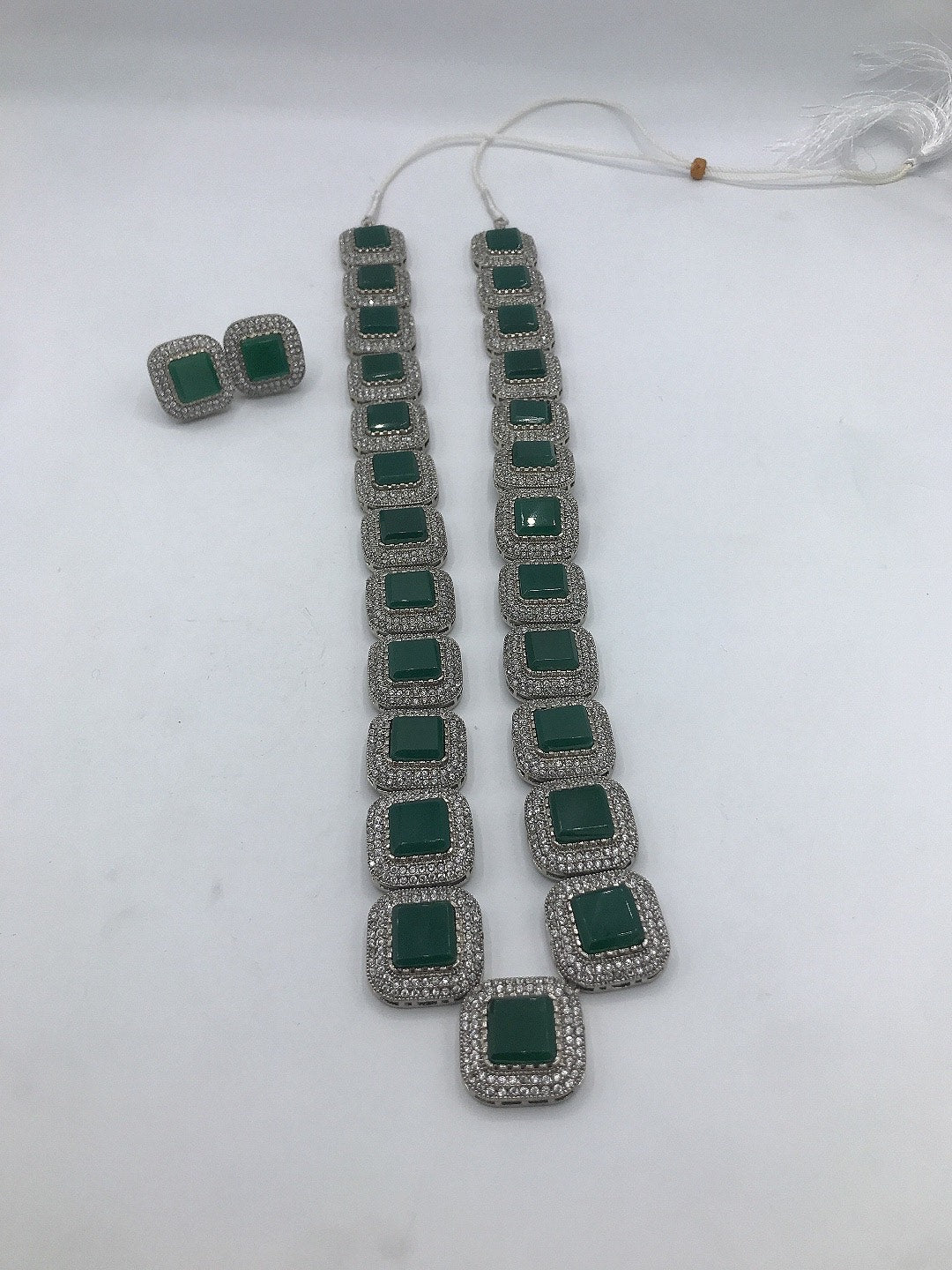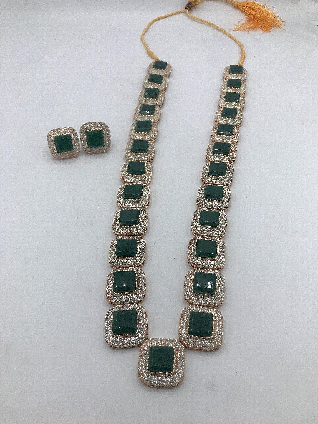 This marvelous american diamond necklace in designed in square shaped diamond using 3D flowers to enhance it's beauty. Available in emerald green.