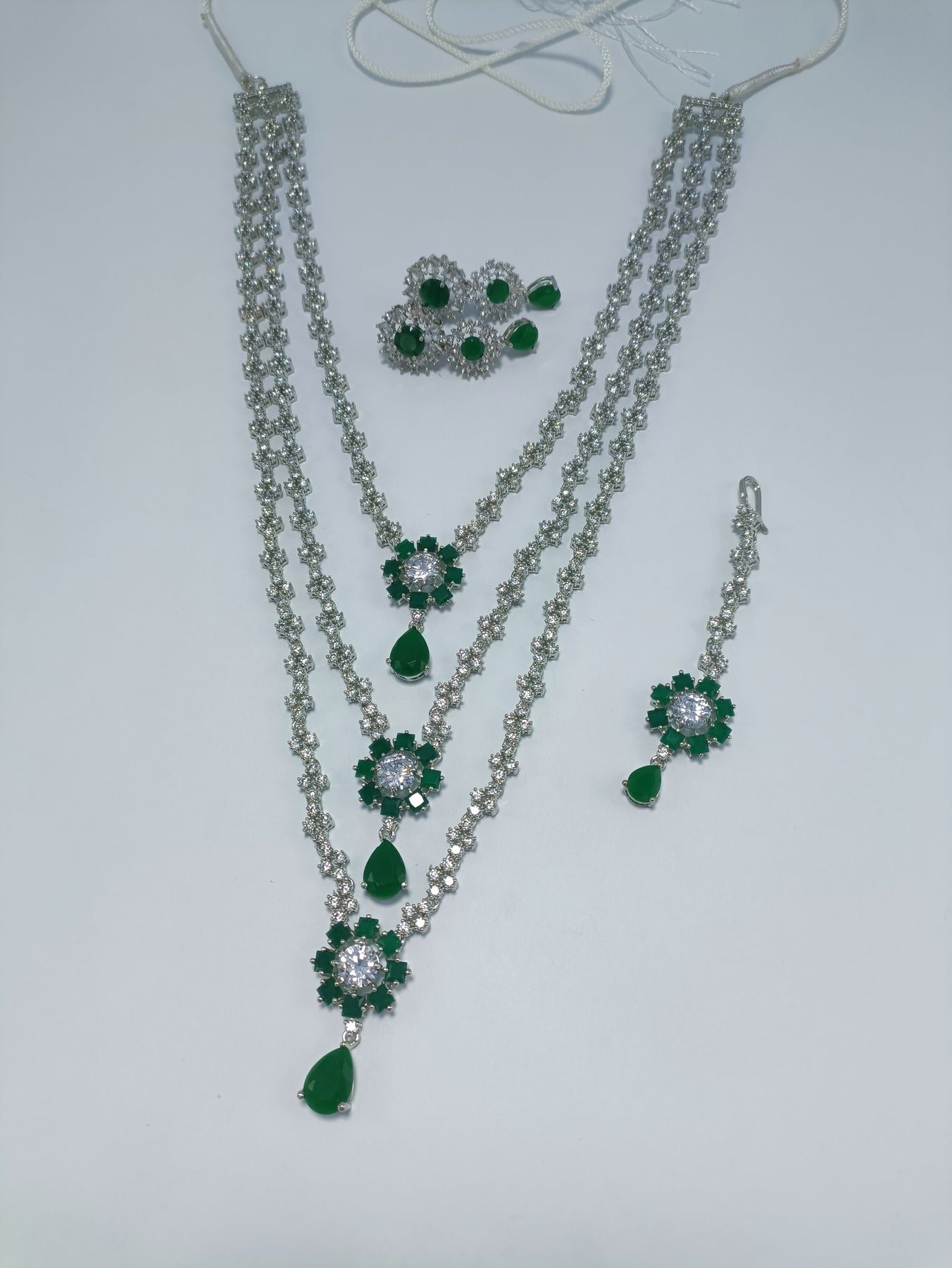 Neeta Ambani diamond cut triple layer Mala available in sapphire silver, emerald silver, silver.