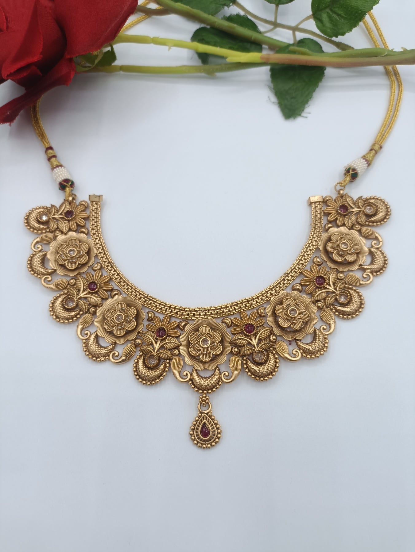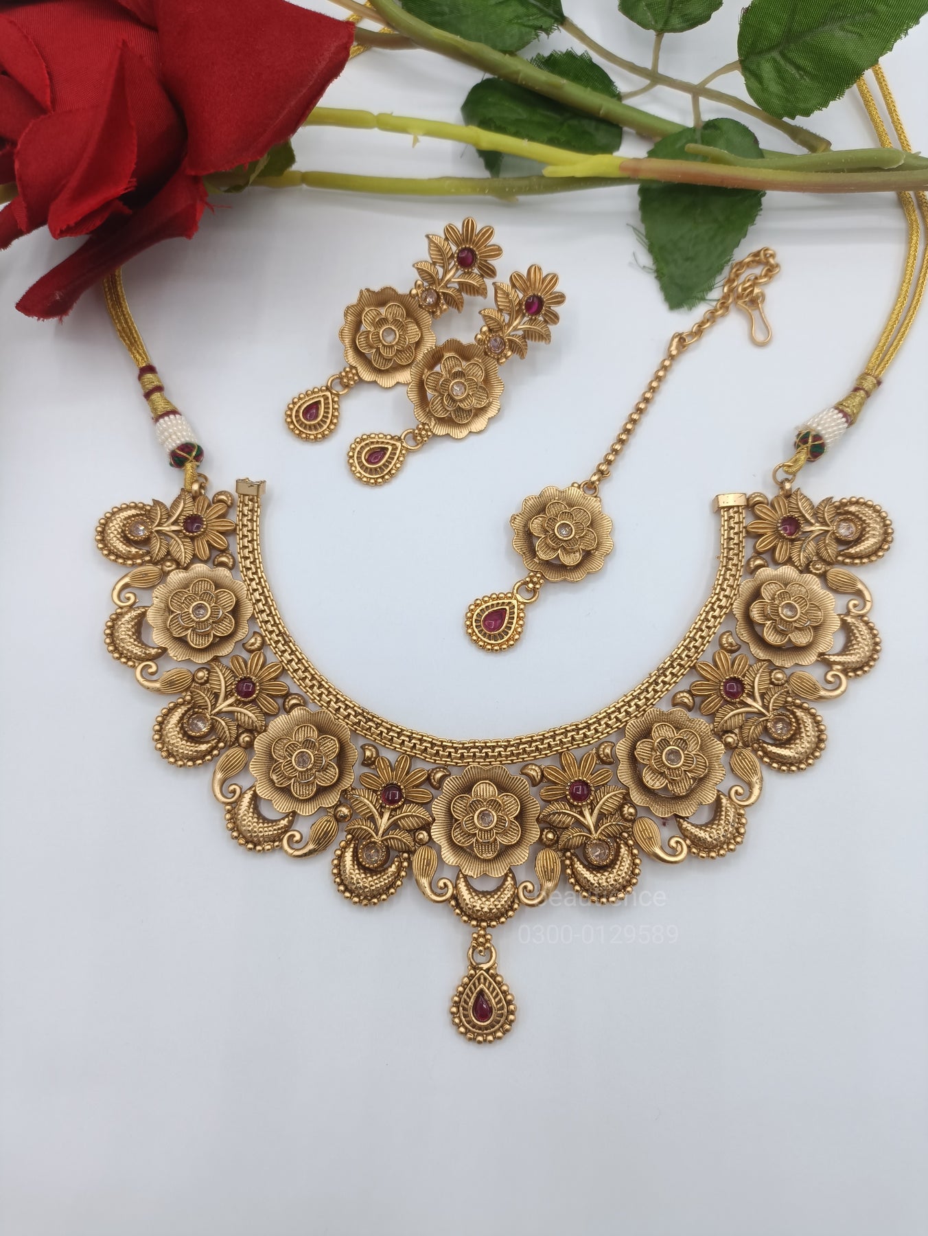 100% Gold Brass with ruby stone along with earrings and bindiya.