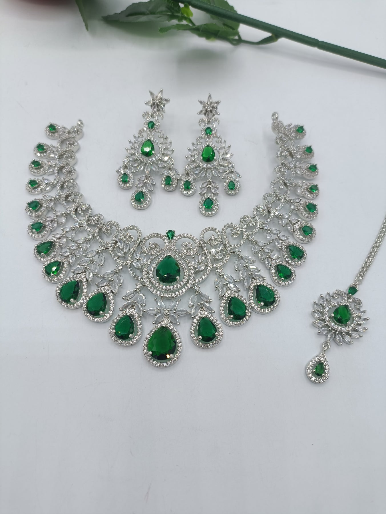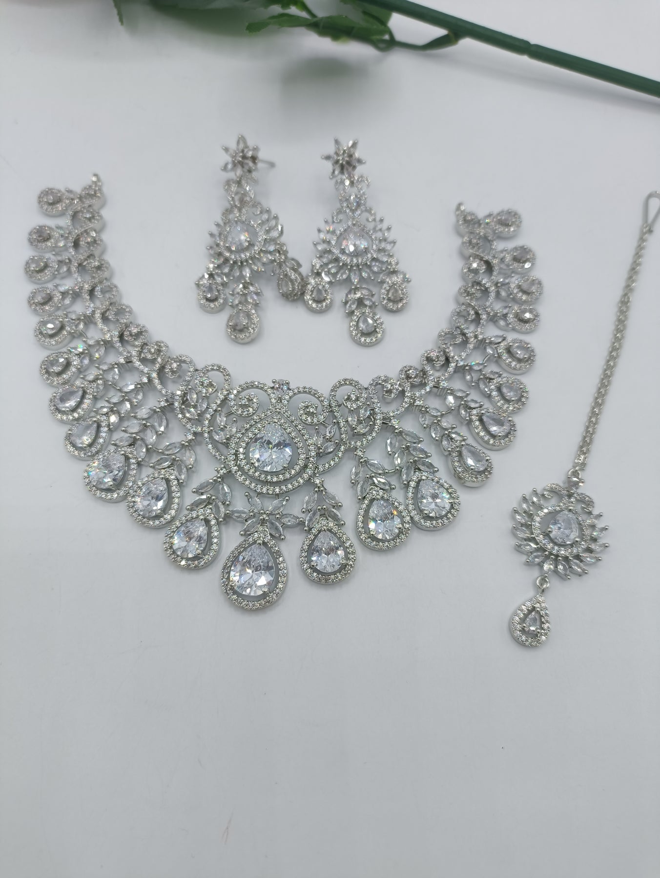 Waterdrop diamond style necklace with long Earrings and Bindiya available in three different variations.