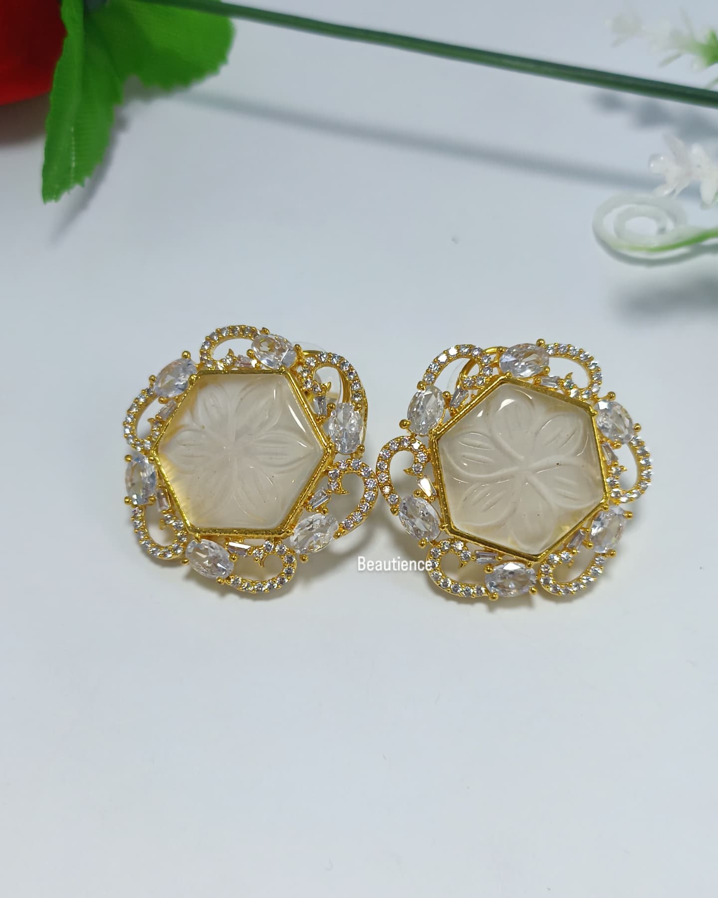 Luxurious carving stone studs available in golden polish, we uses real stones to complete your royal look.